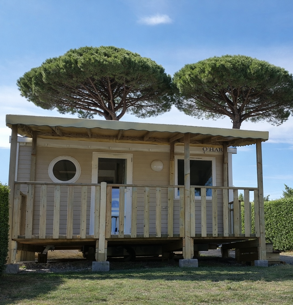 Atypische accommodatie voor 2 personen zonder sanitair of waterpunt. Gemeenschappelijk sanitair bevindt zich in de buurt van de accommodatie. Overdekt houten terras met 2 ligstoelen en een salontafel. De accommodatie is uitgerust met een bed van 140 cm, een kleine koelkast, een magnetron, een kookplaat, een waterkoker en serviesgoed.