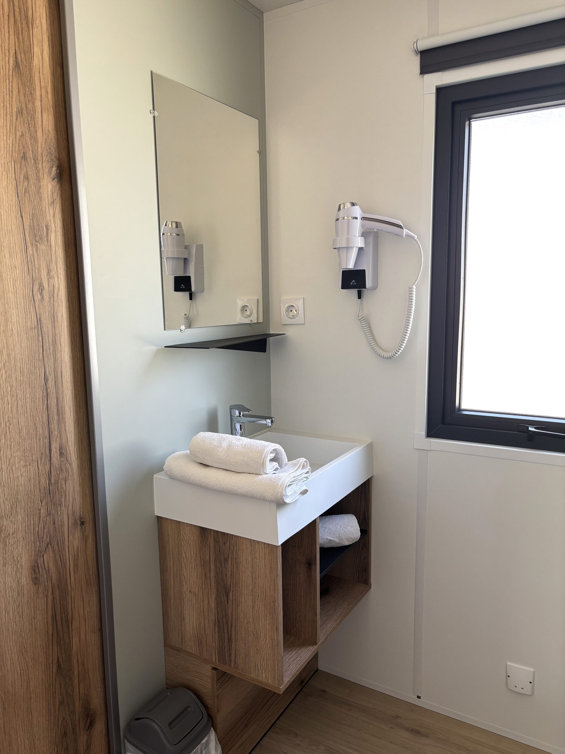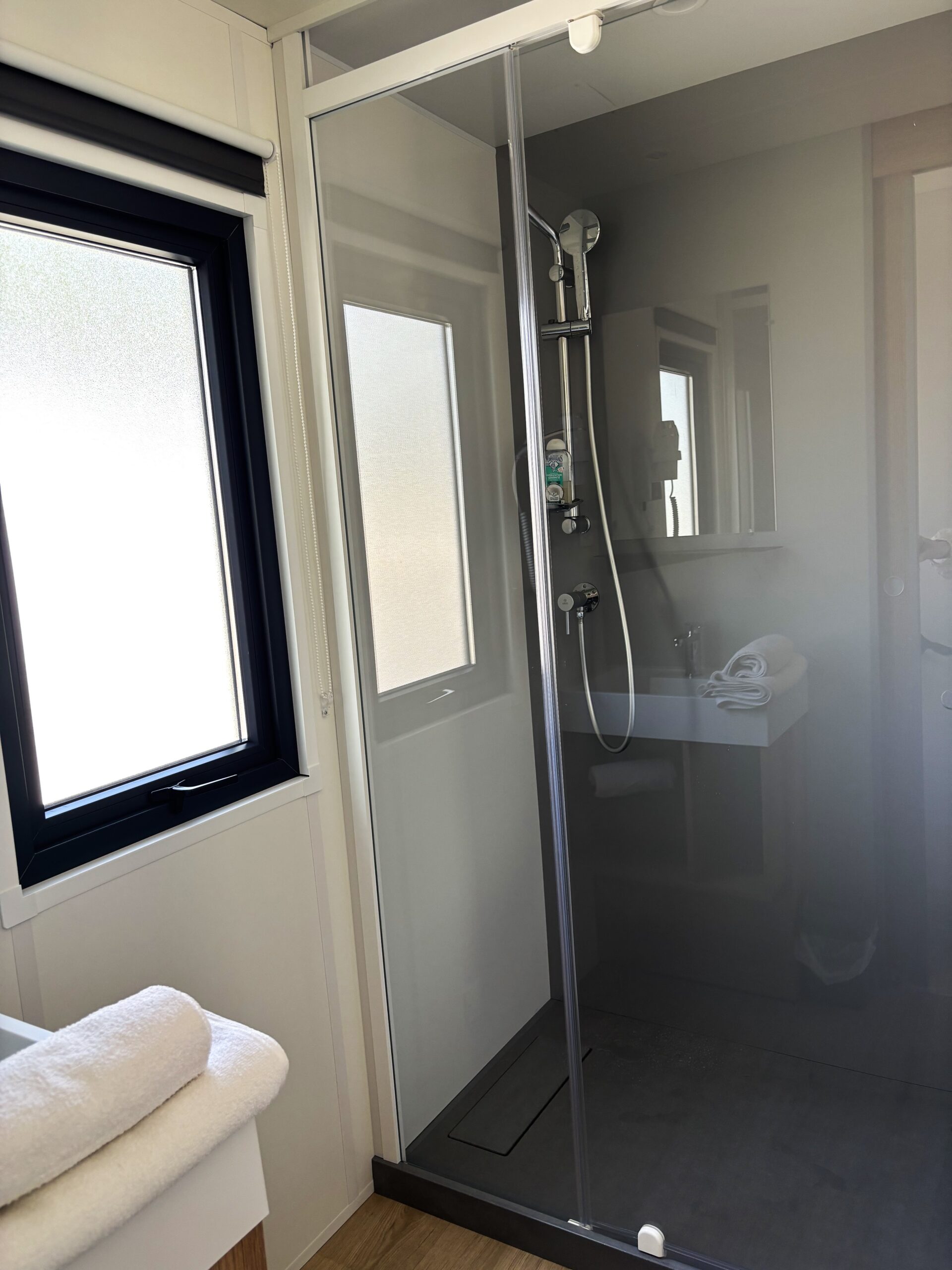 Stacaravan (5 personen) met 2 badkamers (de slaapkamers hebben directe toegang tot hun badkamer).