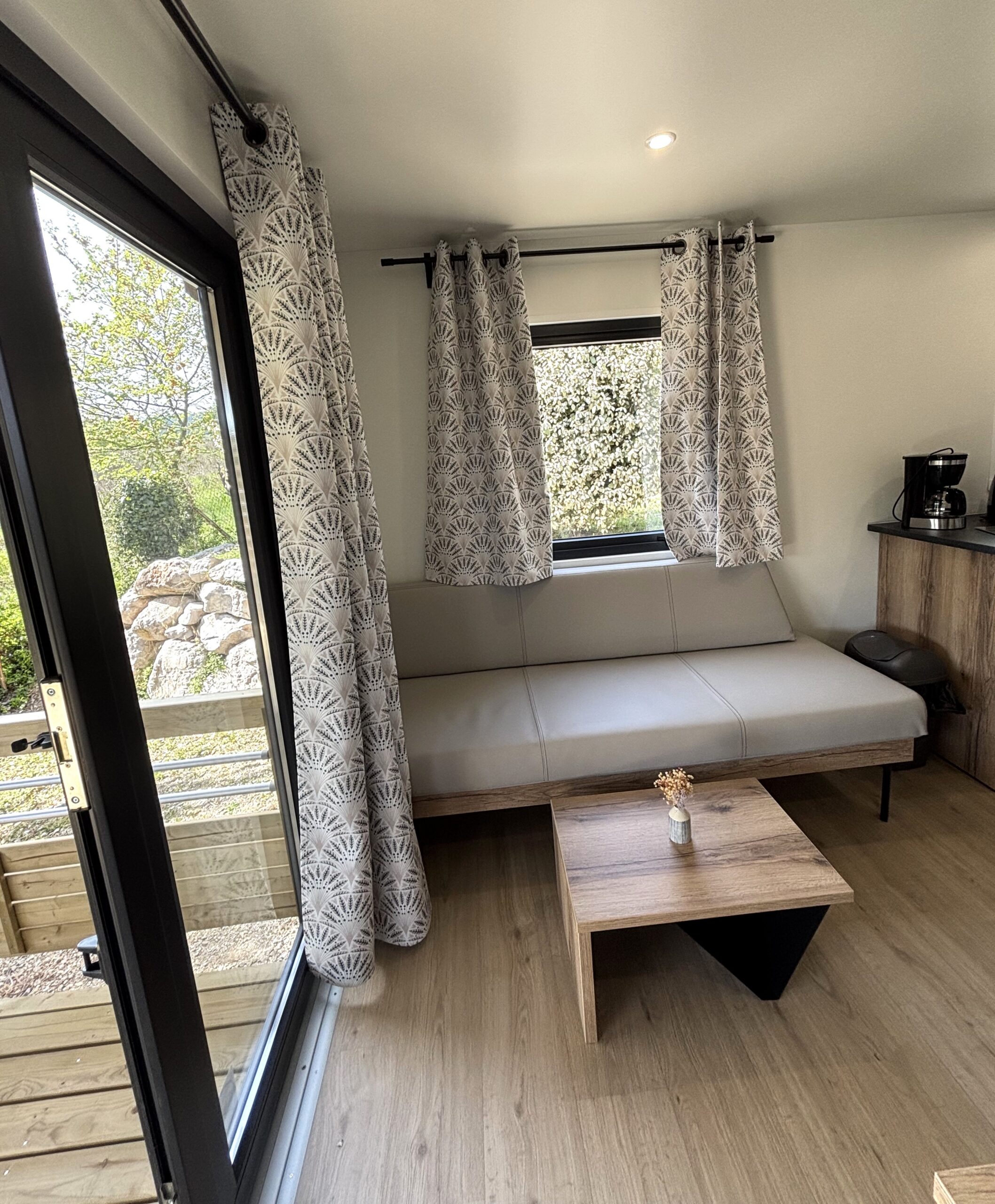 Atypische accommodatie voor 2 personen zonder sanitair of waterpunt. Gemeenschappelijk sanitair bevindt zich in de buurt van de accommodatie. Overdekt houten terras met 2 ligstoelen en een salontafel. De accommodatie is uitgerust met een bed van 140 cm, een kleine koelkast, een magnetron, een kookplaat, een waterkoker en serviesgoed.